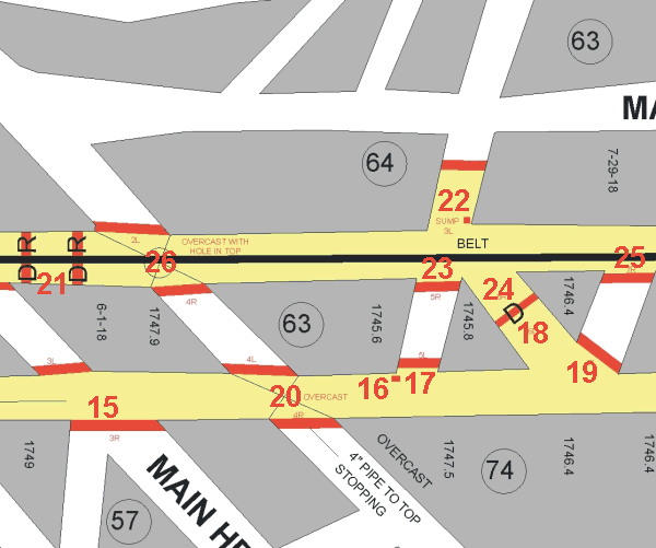 To see detailed sections of the mine map along with photos click on an area below. The numbers that you will see link to a corresponding photo.